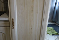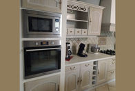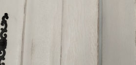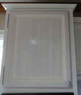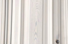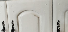 Décors en blanc rosée dont les façades de portes et tiroirs ont été poncées par aérogommage en profondeur afin de dessiner le veinage du bois.