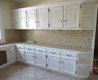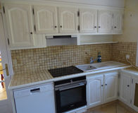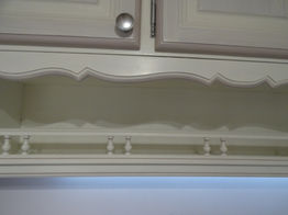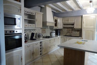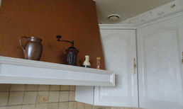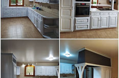 Affin de rendre cette cuisine plus moderne, les corniches ont été ôtées et ajouté un profilé sur la hotte.